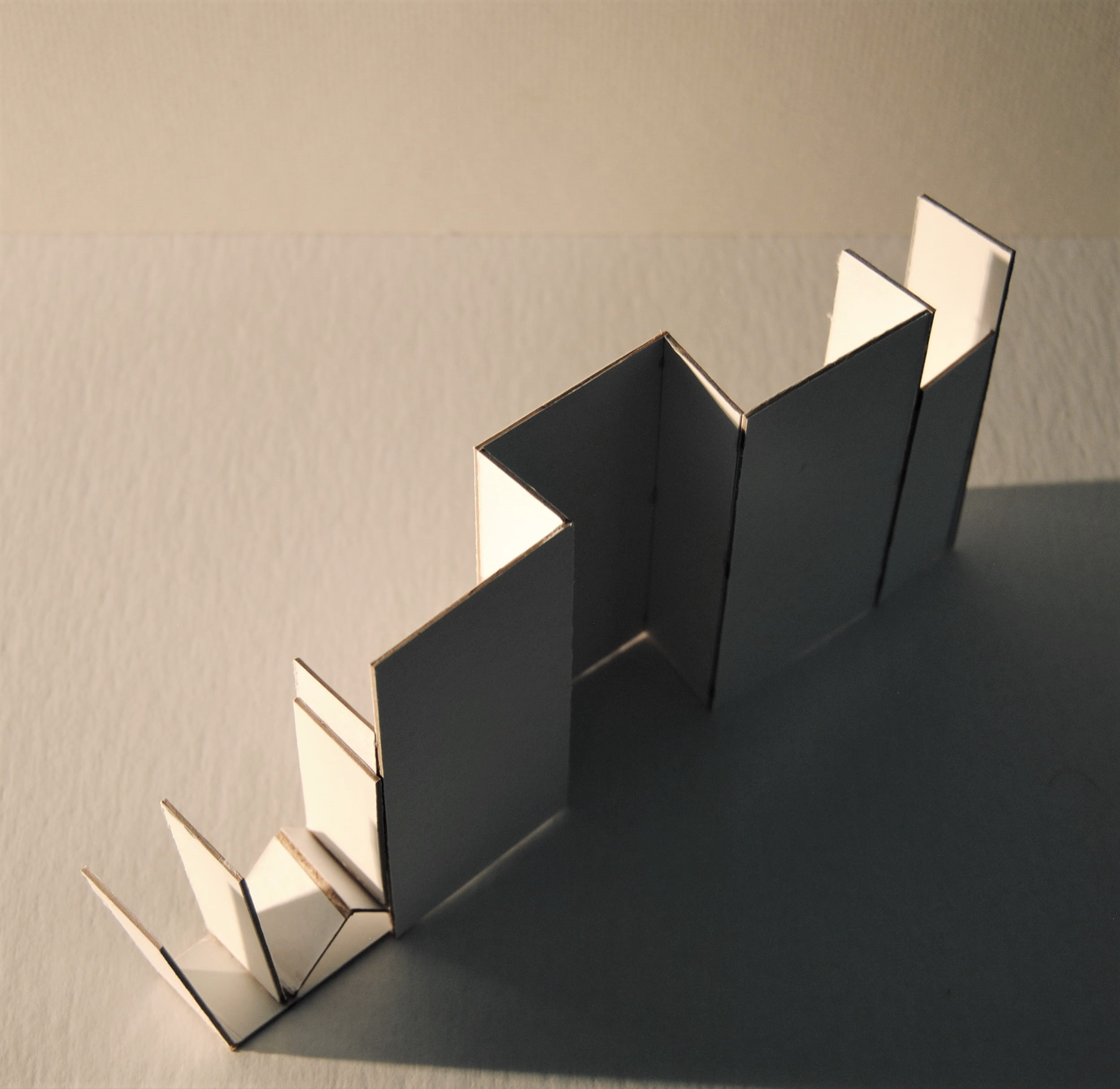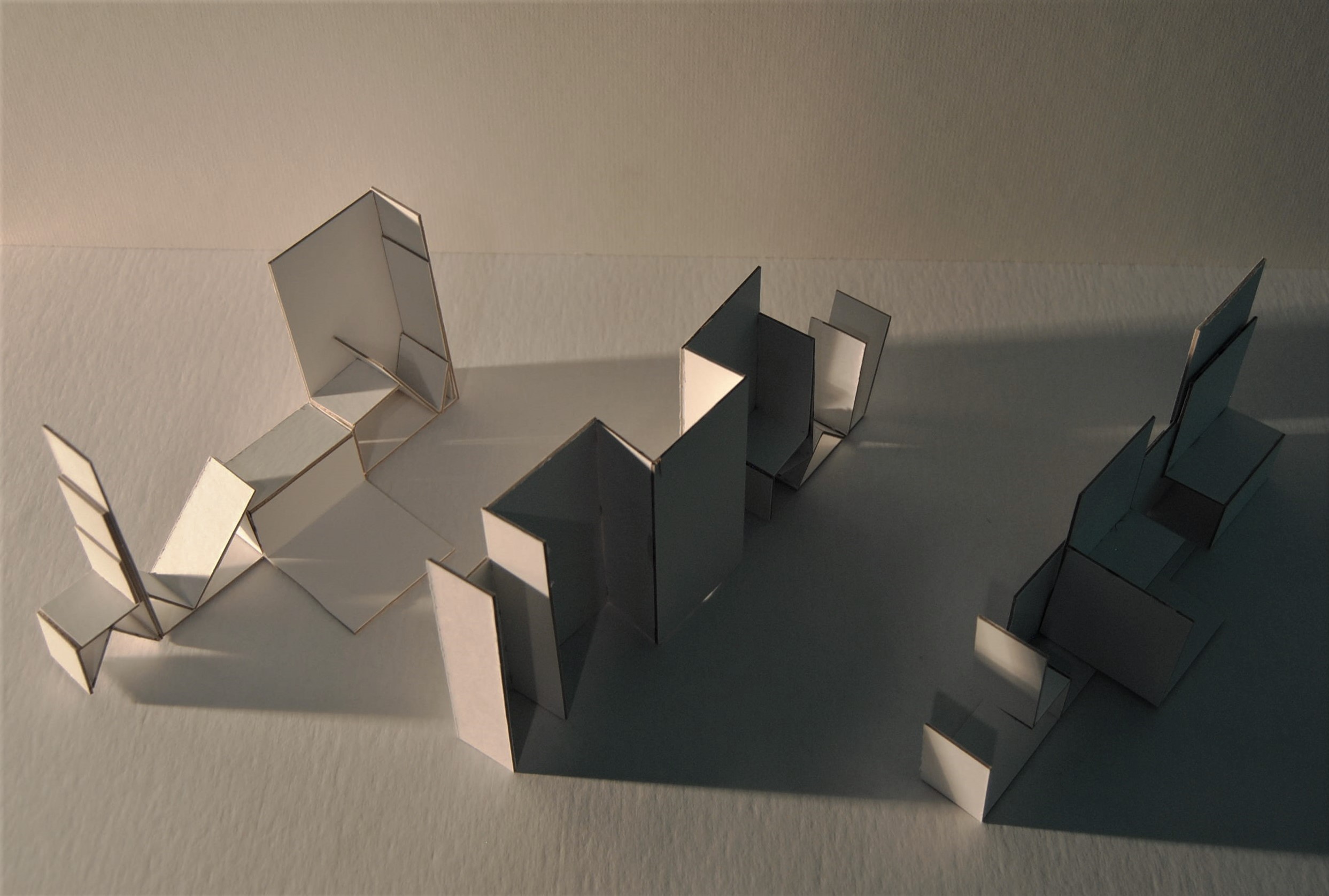This exercise was to explore the confines of a 12’x12’ room, using movements of the body as a tool for measurement. Quantitative data such as distance, relative location, height, angle etc. were measured using various motions at the perimeter of the room [see video]. Different levels of movement (standing, sitting, laying), relative location of extremities, and joint angles of rotation were used as basic standards when mapping out the language of movement diagrams [see diagrams below]. Standards including hatching were established, where the darkest solid hatch are for movements that are closest while the diagonal hatches are for movements that are hidden or behind the viewer. Representation of the body in space, levels of movement, and rotation were translated into basic making definitions or instructions for model fabrication [see images below]. Definitions include dividing or folding lengthwise by 1/4, 1/2, 3/4, dividing or folding widthwise by 1/2, and rotating 90/45 degrees along or adjacent axis. These sketch models explore these making instructions while following the movement sequences performed at each wall - providing an alternative way in representing architecture.